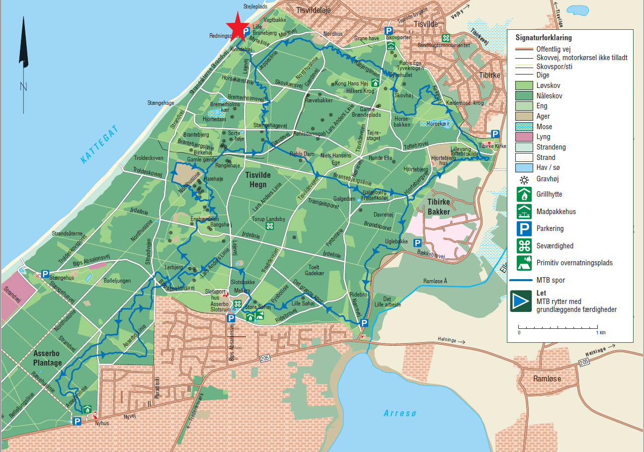 Tisvilde Hegn: har et "blåt" MTB spor, som er både for begyndere og øvede. Det er rigtig godt afmærket med blå pile og prikker og man kan se på kort over sporet ved starten af sporet eller hos os. Du kan også finde et billede af kortet i vores fotos her på siden.
